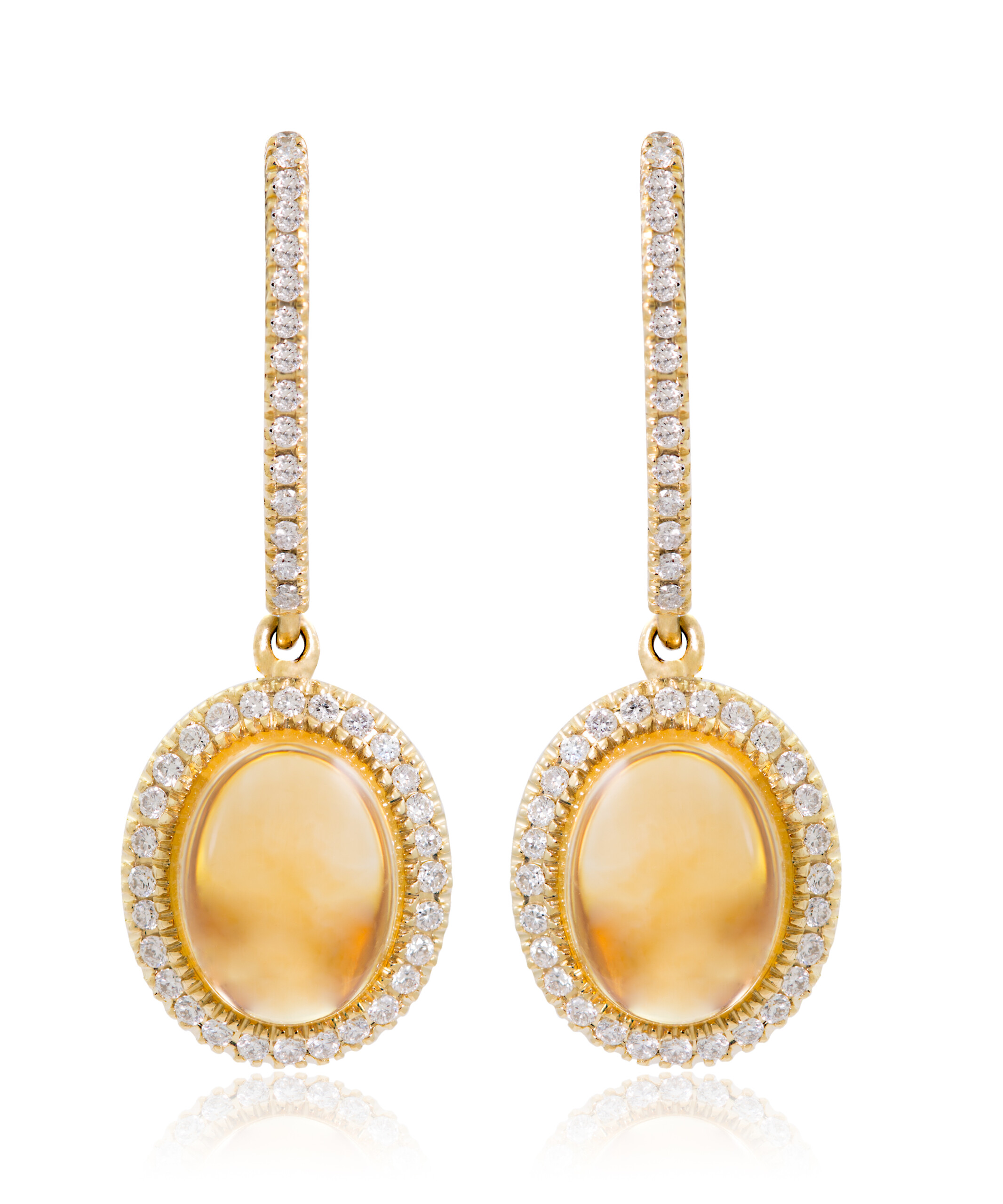 Two sunny citrine cabochon gems are set in a frame of glittering diamonds in these opulent earrings.